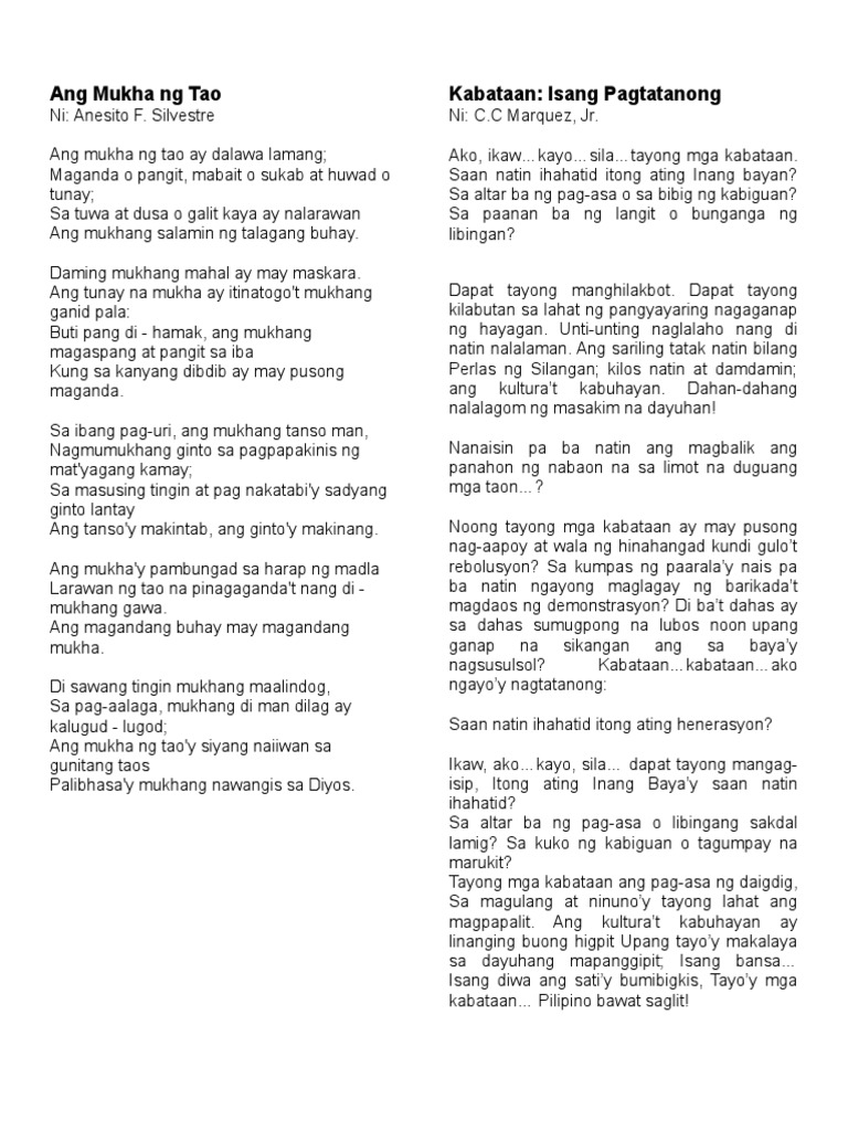 Kabataan isang pagtatanong c c marquez jr. Up to 3 cash back Tayong mga kabataan ang pag-asa ng daigdig Sa magulang at ninuno y tayong lahat ang magpapalit Ang kultura t kabuhayan ay linanging buong higpit Upang tayo y makalaya sa dayuhang mapanggipit. Ang Kabataan Noon at Ngayon Ang kabataan noon at ngayonay may maliit lamang na puwang sa kanilang pagkakalayo sa kilos gawi ugali pananamit damdamin at iba pang bagay. Ako ikawkayosilatayong mga kabataan Saan natin ihahatid itong ating inang bayan.