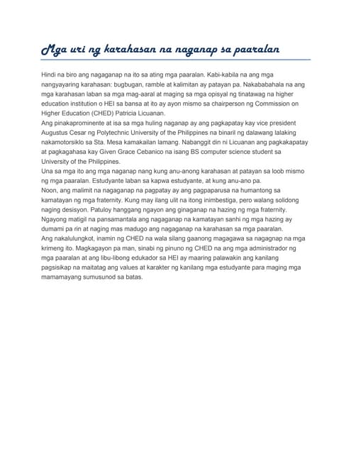 Pages 7 This preview shows page 2 - 4 out of 7 pages. Maaaring ang taong nakararanas ng pang-aabuso ay makaranas ng mga sumusunod. Dahil sa awa sa sarili galit at kawalang magagawa ang ilang biktima ng pang-aabuso ay nagpapakita ng self-destructive behaviors o nagtatangkang magpakamatay.